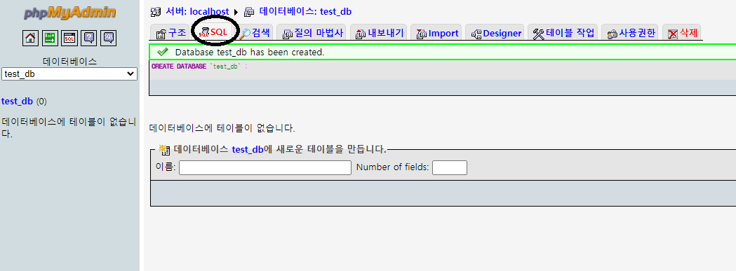 로그인을 하시면 위와 같은 화면이 나올 거예요 화면 좌측을 보시면 information_schema , mysql , pypmyadmin이라는 것이 보이실 텐데 이게 데이터베이스 명입니다. 하지만 3개의 데이터베이스는 데이터베이스를 관리하는 데이터베이스라고 생각하시면 되고 우리는 해당 데이터 베이스를 건드리지 않고 화면 중간쯤에 보이는 새 데이터베이스 만들기를 실행할 겁니다. 새 데이터베이스 만들기 란에 test_db라고 입력하고 만들기 버튼을 클릭해 주세요.