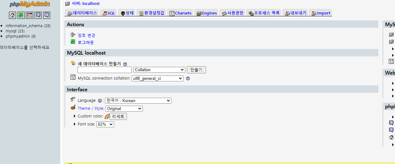 http://localhost/myadmin/ 을 브라우저 창에 입력하시면 아래와 같은 페이지가 보이실 겁니다.