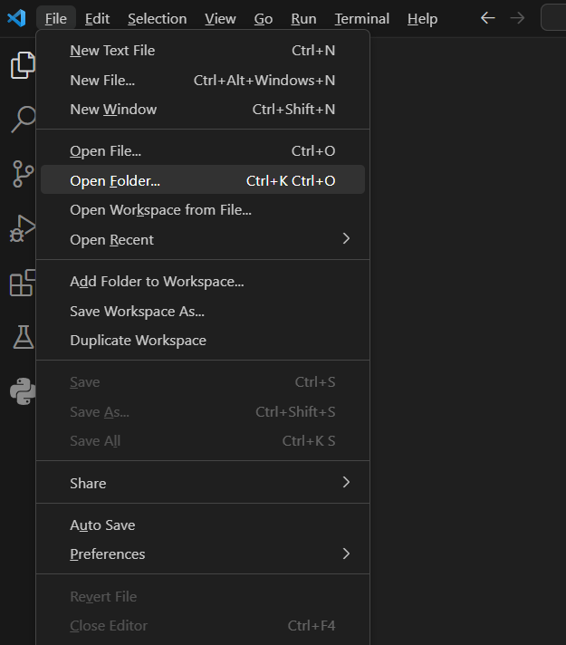 3. 오픈 폴더를 하셔서 원하는 혹은 가지고 계신 py파일들이 위치한 곳을 선택하시면 됩니다.