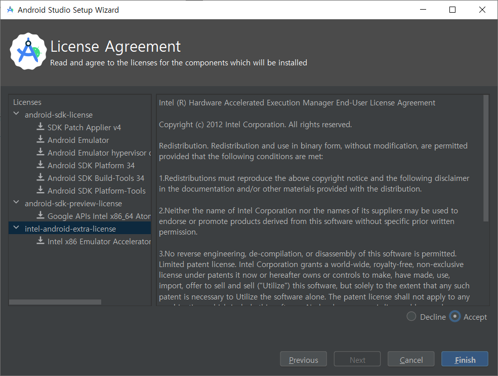 그리고 아래 창과 같이 전부 Accept 하셔야 다음으로 넘어 갈 수 있습니다.