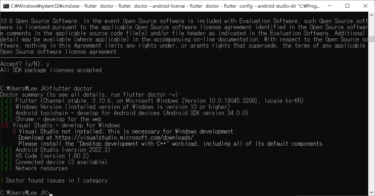 이다음에도 여러 번 물어보는데 계속해서 y를 입력하고 넘어가자 그 후에 flutter doctor를 다시 실행하면 오류가 없어진 것을 볼 수 있다.