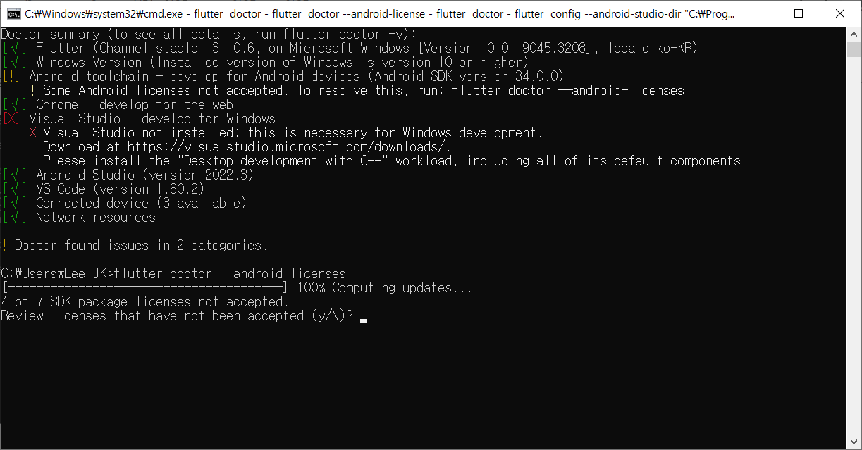 일단 해당 창은 두고 좀전에 열었던 cmd 창에서 flutter doctor를 재실행해봅니다.