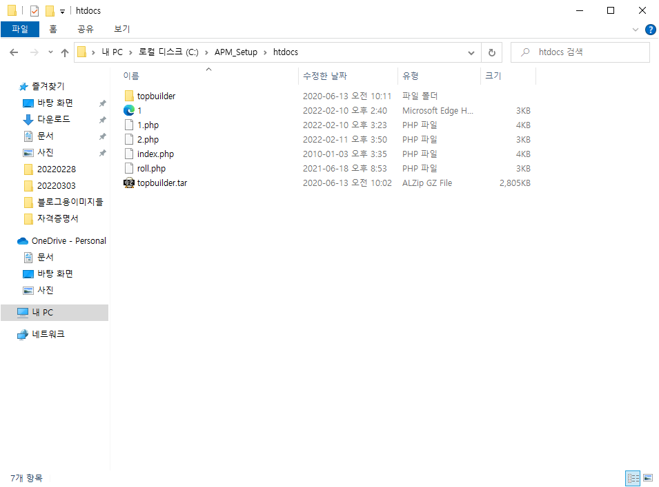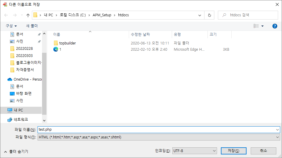 그리고 웹의 루트 디렉터리(폴더) C:\APM_Setup\htdocs 안에 test.php라는 이름으로 저장합시다.!
