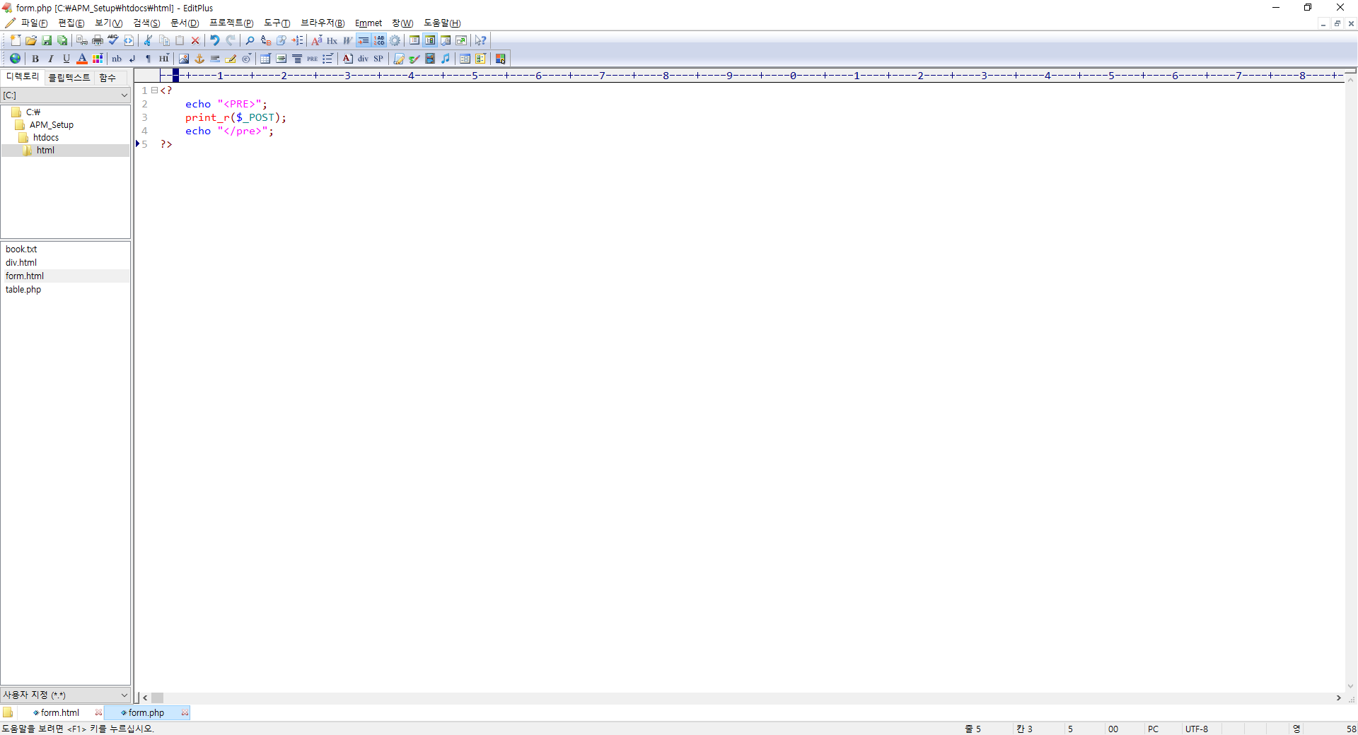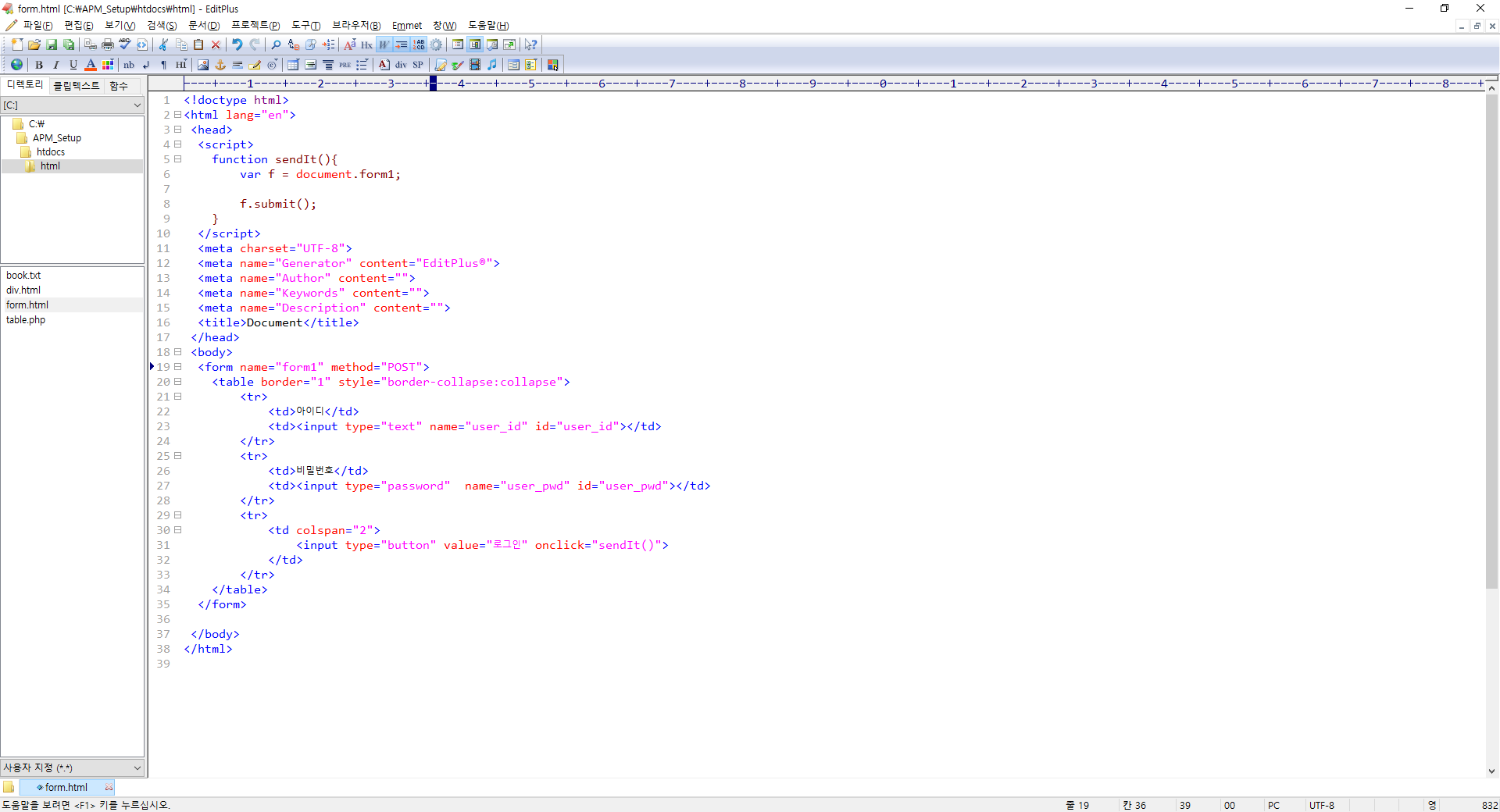 자 이제 19번째 라인의 액션값을 봅시다 액션 값을 보면./form.php라고 되어 있는데 여기서./ 는 현제 페이지가 있는 디렉터리를 뜻하고 뒤의 파일명으로 폼을 전송하겠다는 뜻입니다.