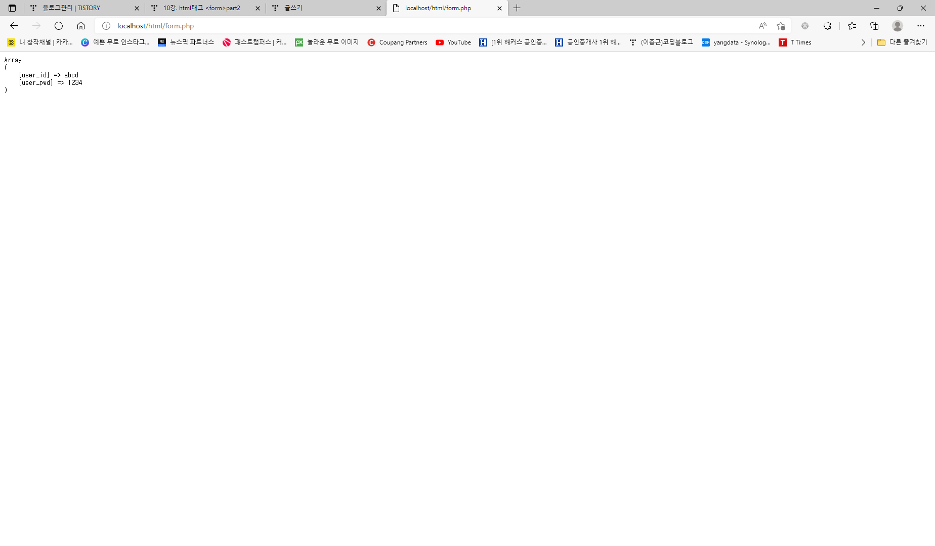 자 이제 http://localhost/html/form.html을 브라우저에 입력하신 후에 아이디란 비밀번호란에 아무 값이나 입력한 후에 저장 로그인 버튼을 눌러보시기 바랍니다.