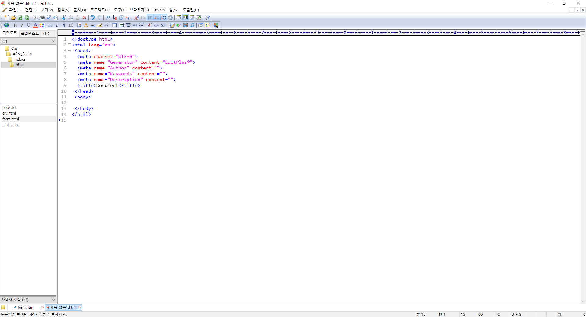 자 이제 form.html과 같은 디렉터리에 form.php 파일을 만들어 봅시다. 에디트 플러스 ctrl+shift+n (파일-> 새 파일-> HTML 페이지) 하시면 아래와 같이 나오시죠? 자 이제 php 맛보기 들어갑니다. 아래 코딩을 전체 선택 후 삭제해주세요.