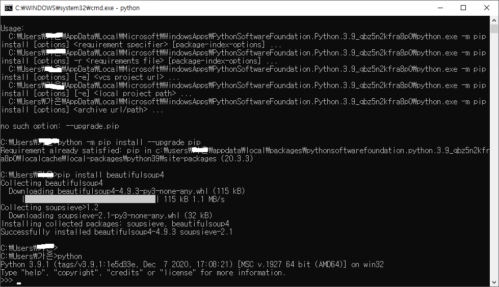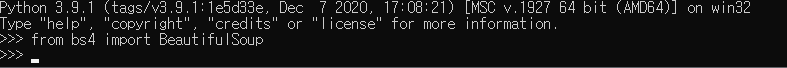 4. 터미널에서 from bs4 import BeautifulSoup 실행 시 아무런 반응 없으면 정상 설치된 것이다.
