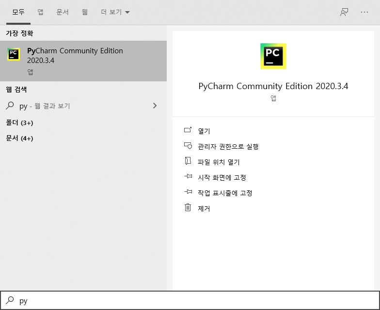 윈도우키를 누르고 pycharm을 검색하면 실행하실 수 있습니다.